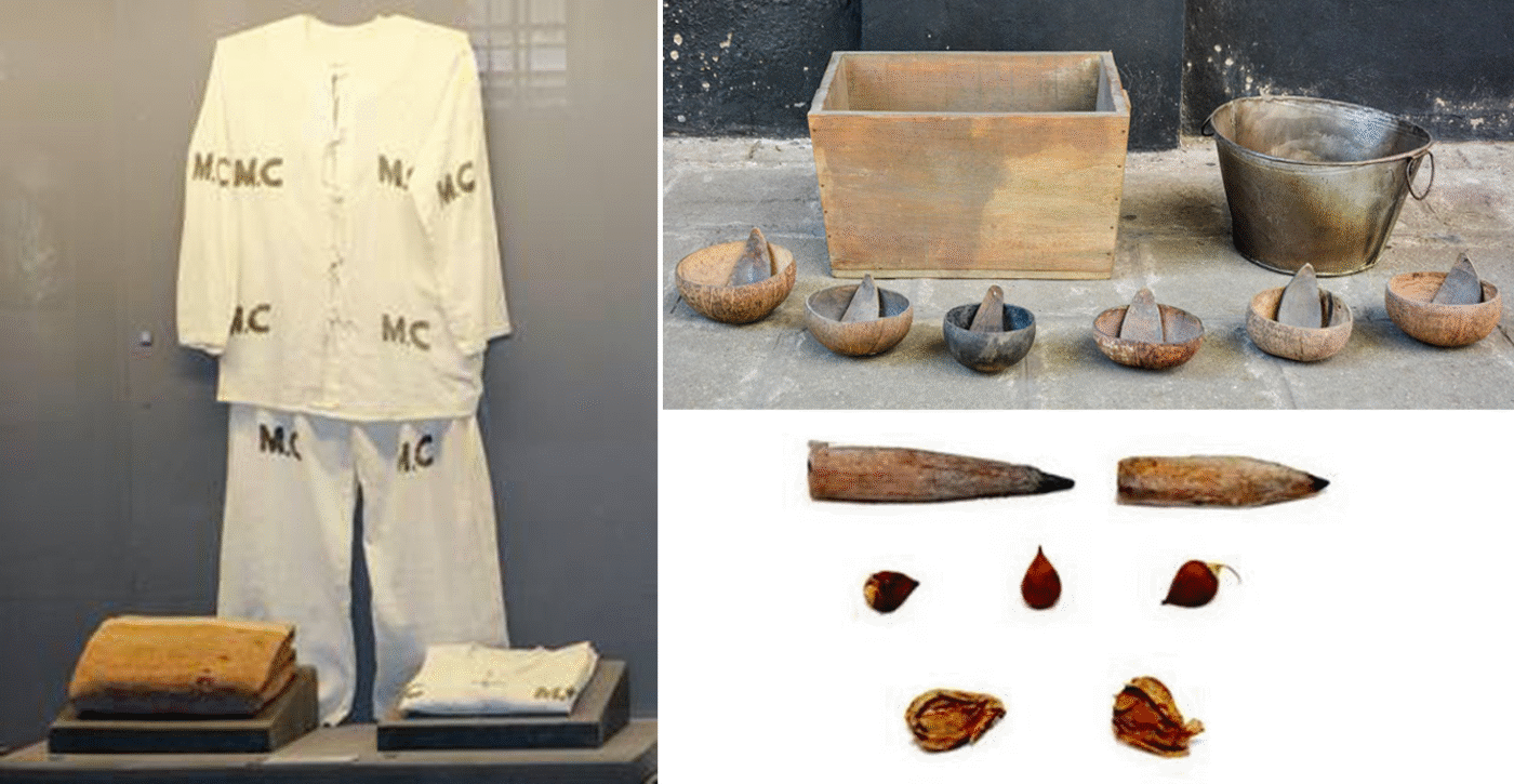 - Áo tù: Những bộ áo tù cũ kỹ, sờn bạc thể hiện rõ sự thiếu thốn, khắc nghiệt mà các tù nhân từng phải chịu đựng.